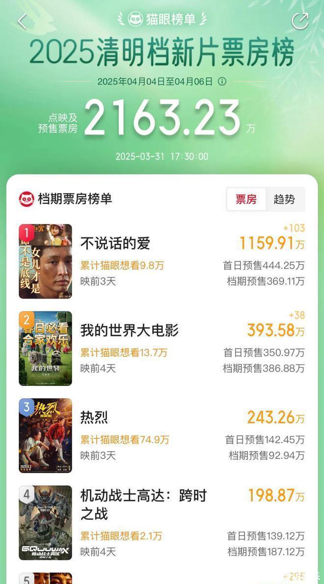 相比之下,今年清明档《向阳·花》《不说话的爱》互相撞车的受众,《高达》《我的世界》作为进口片在IP吸引力上的欠缺,《阳光照耀青春里》《猎狐行动》的质量未卜,既缺乏IP基础,又面临《哪吒2》的余威压制,让整个清明档市场前景堪忧。